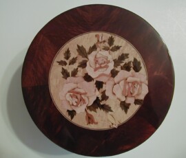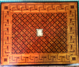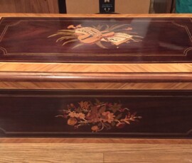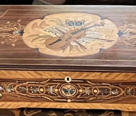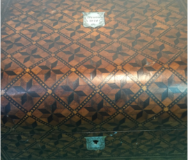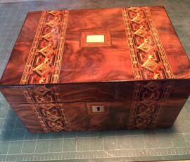 This particular box shown with the burnt on initials HH belongs to someone who now, an adult and looking back at the damage with regret on this family history piece wanted it restored without to customization. I replaced all the field veneer and restored the damaged geometric banding. The interior damaged blue leather writing area was replaced and a set of appropriate style hinges installed. The damage to the back and other areas were also re-veneered with similar matching veneer used on the top. Although not shown the base was recovered with a soft red felt .