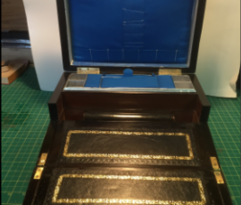 The one shown is a writing slope which opens to reveal a leather surface writing area which needed replacing and the related wood structure below needed attention both surfaces hinge up enabling storage of supplies below. Unfortunately, the inkwells were missing from the cavities on each side of the writing area.
