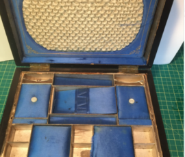 This is one of those pieces of functional furniture that was a must have for the traveler before the computer age. It would contain complete stationary supplies- pens, ink in sealed bottles, used before fountain and ballpoint pens, pencils, blotting paper, envelopes and all your contact addresses, typically locked for privacy.