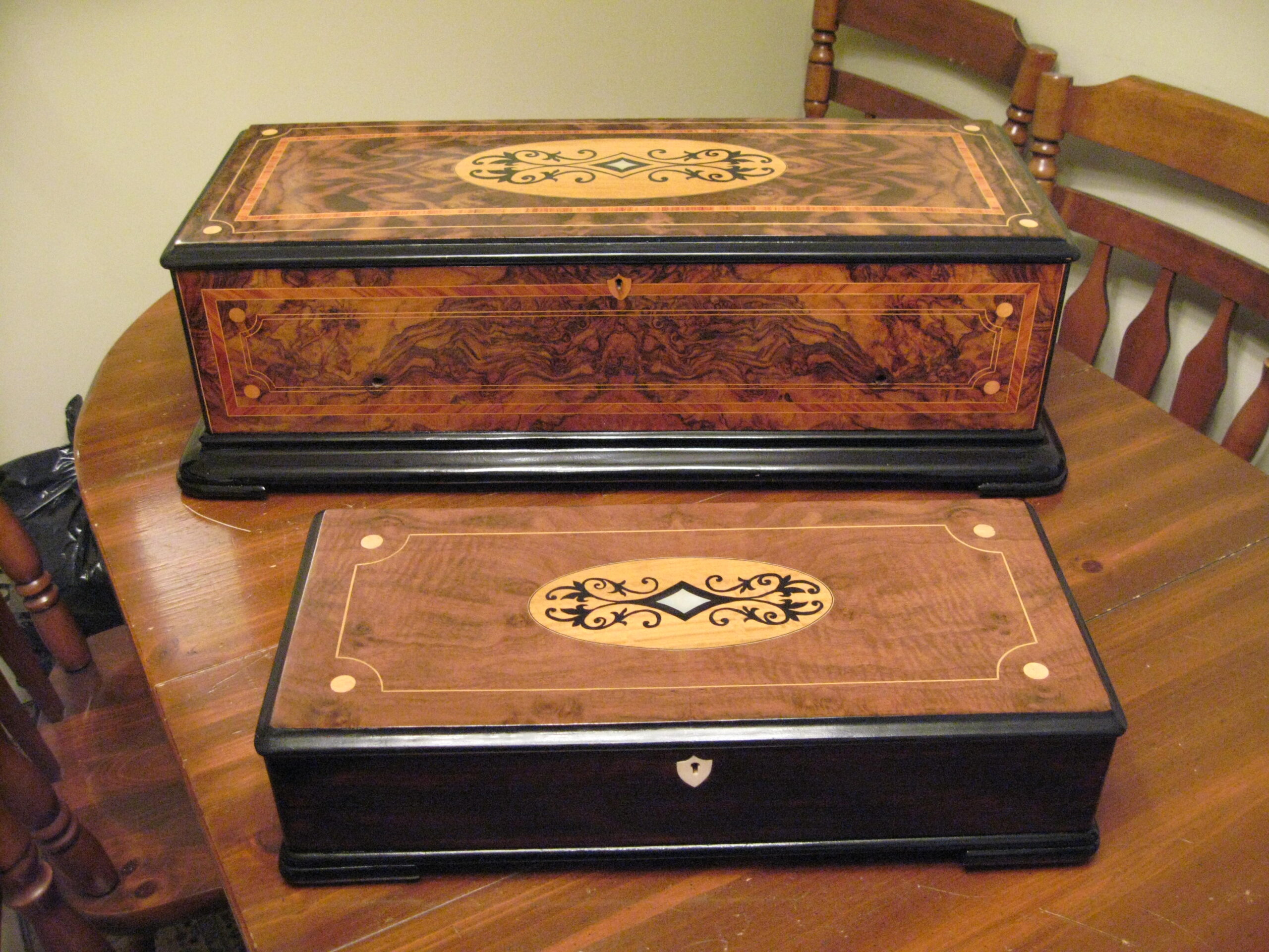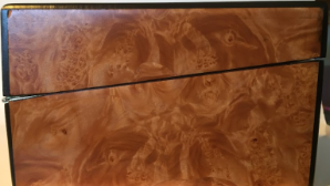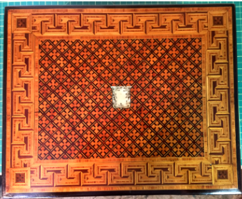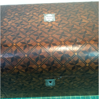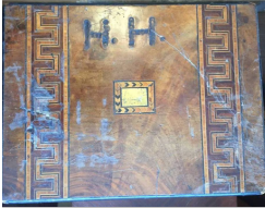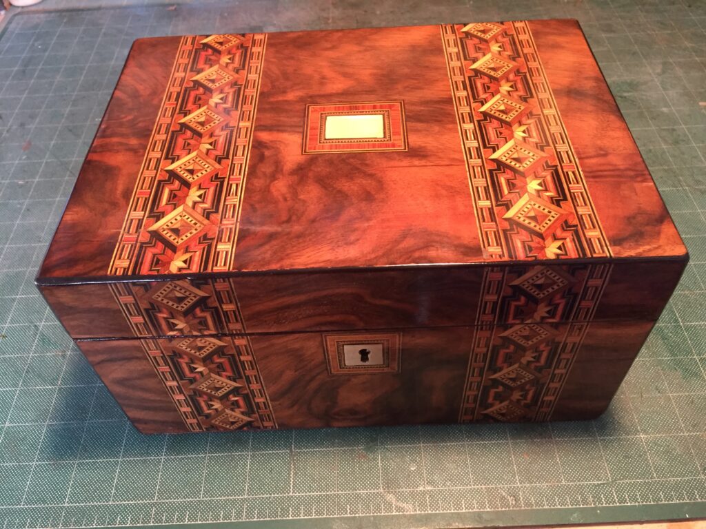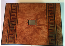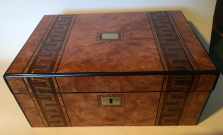This particular box shown with the burnt on initials HH belongs to someone who now, an adult and looking back at the damage with regret on this family history piece wanted it restored without to customization. I replaced all the field veneer and restored the damaged geometric banding. The interior damaged blue leather writing area was replaced and a set of appropriate style hinges installed. The damage to the back and other areas were also re-veneered with similar matching veneer used on the top. Although not shown the base was recovered with a soft red felt .