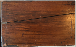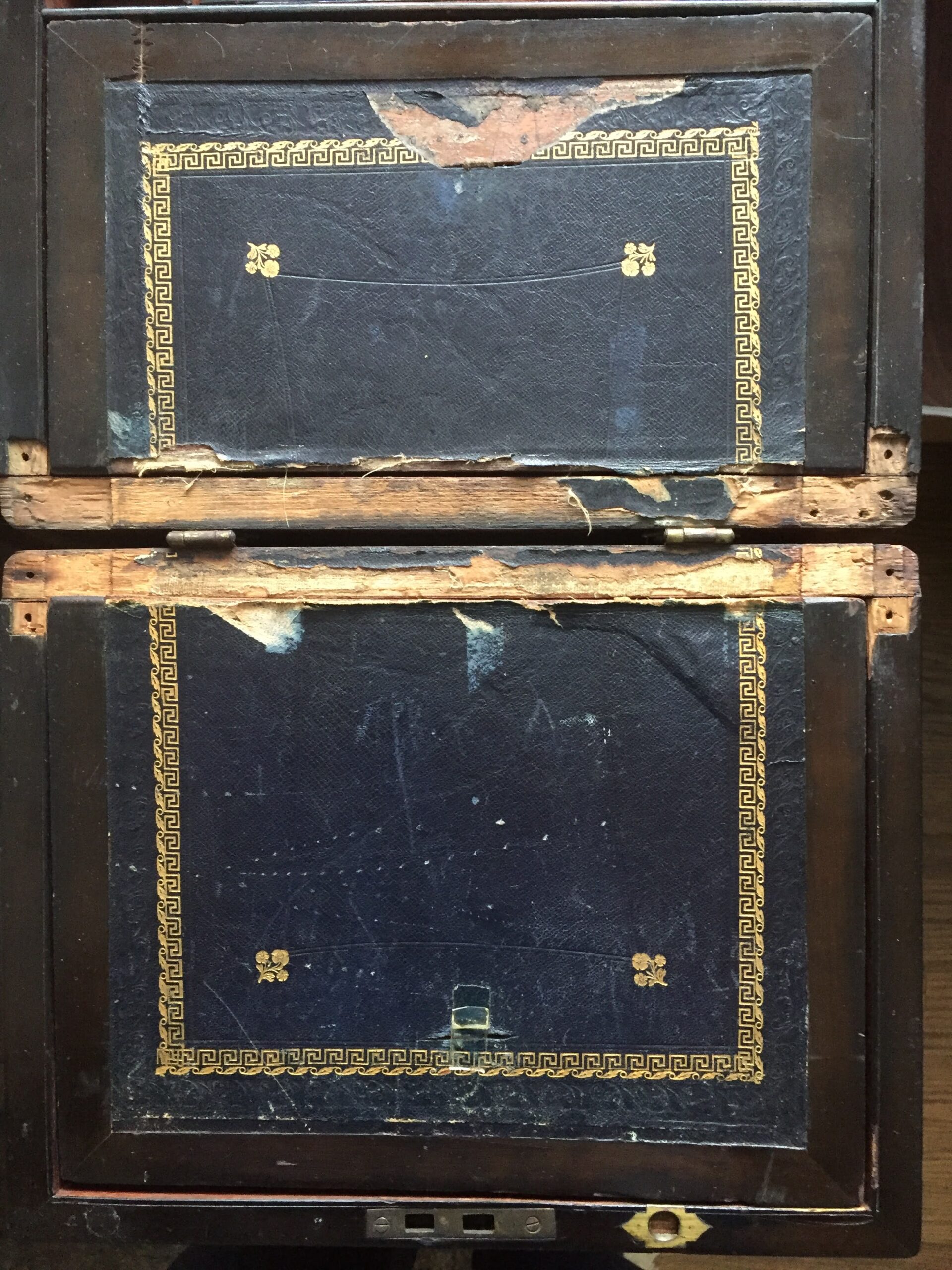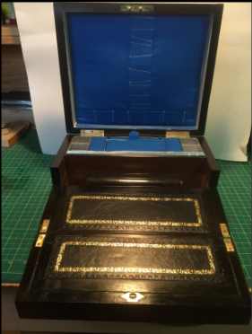 Like all writing slopes the writing area needed replacing and the related wood structure below needed attention both surfaces hinge up enabling storage of supplies below. Unfortunately the inkwells were missing from the cavities each side of the writing area.