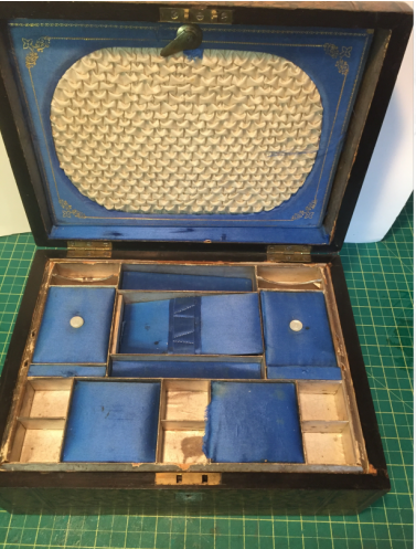 This combination of a jewel box suggests it was custom designed for a lady traveler. I am not sure what the custom stitching on the inside of the lid was for perhaps a set of cutlery…one must be ‘civilized’, you know!