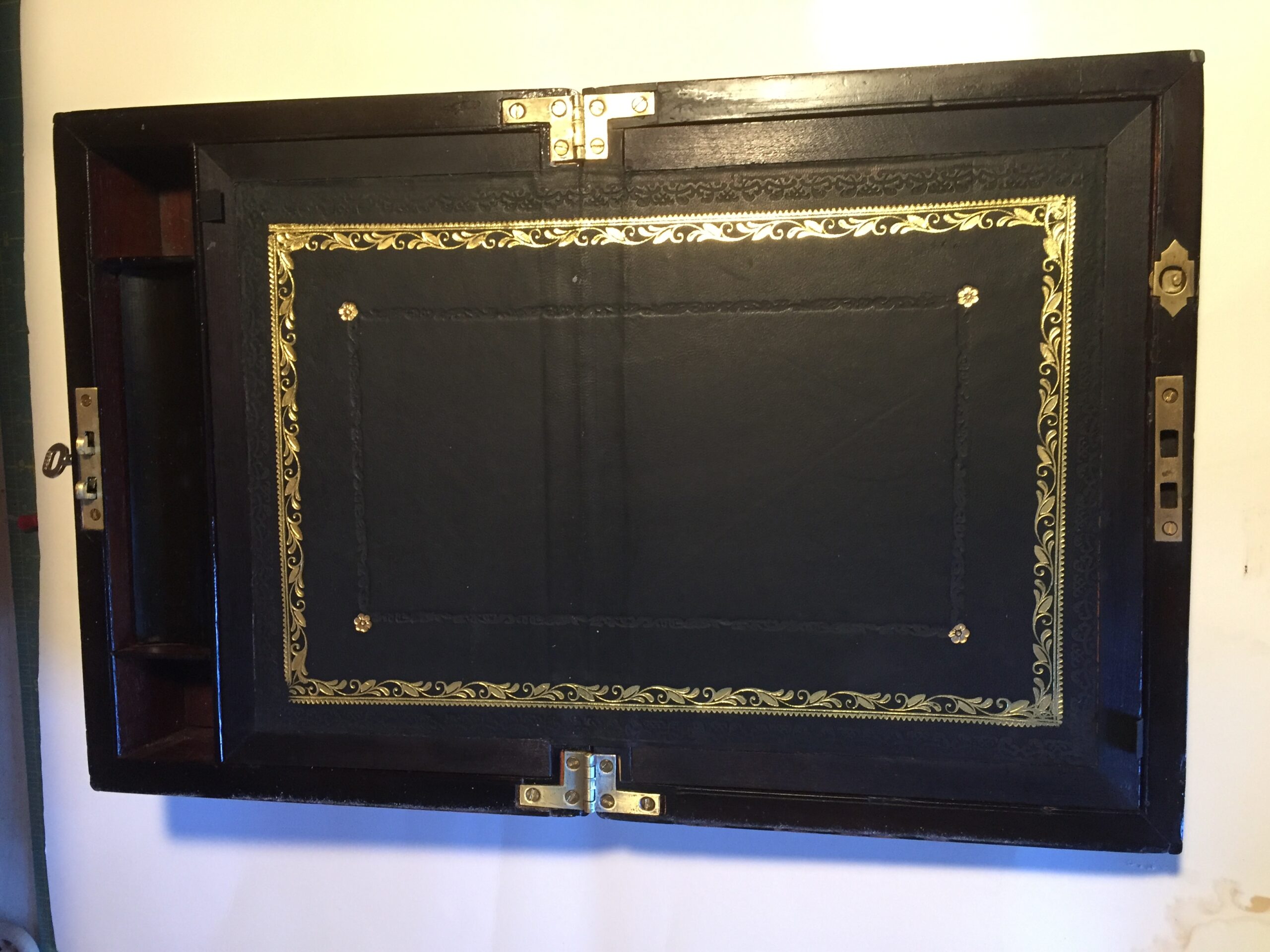 This is one of those pieces of functional furniture that was a must have for the traveler before the computer age. It would contain complete stationary supplies- pens, ink in sealed bottles, used before fountain and ballpoint pens, pencils, blotting paper, envelopes and all your contact addresses, typically locked for privacy.