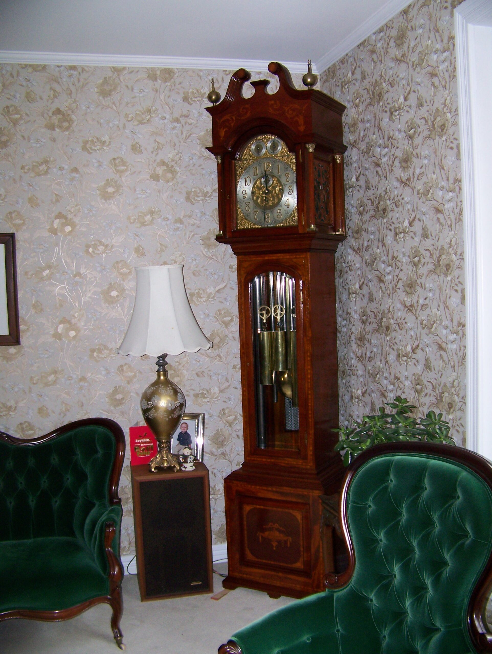 This grandfather clock was put in storage during a renovation, during which it sustained fire damage. If you look closely you can see that the design is a mirrored image with some of the original design still in place.